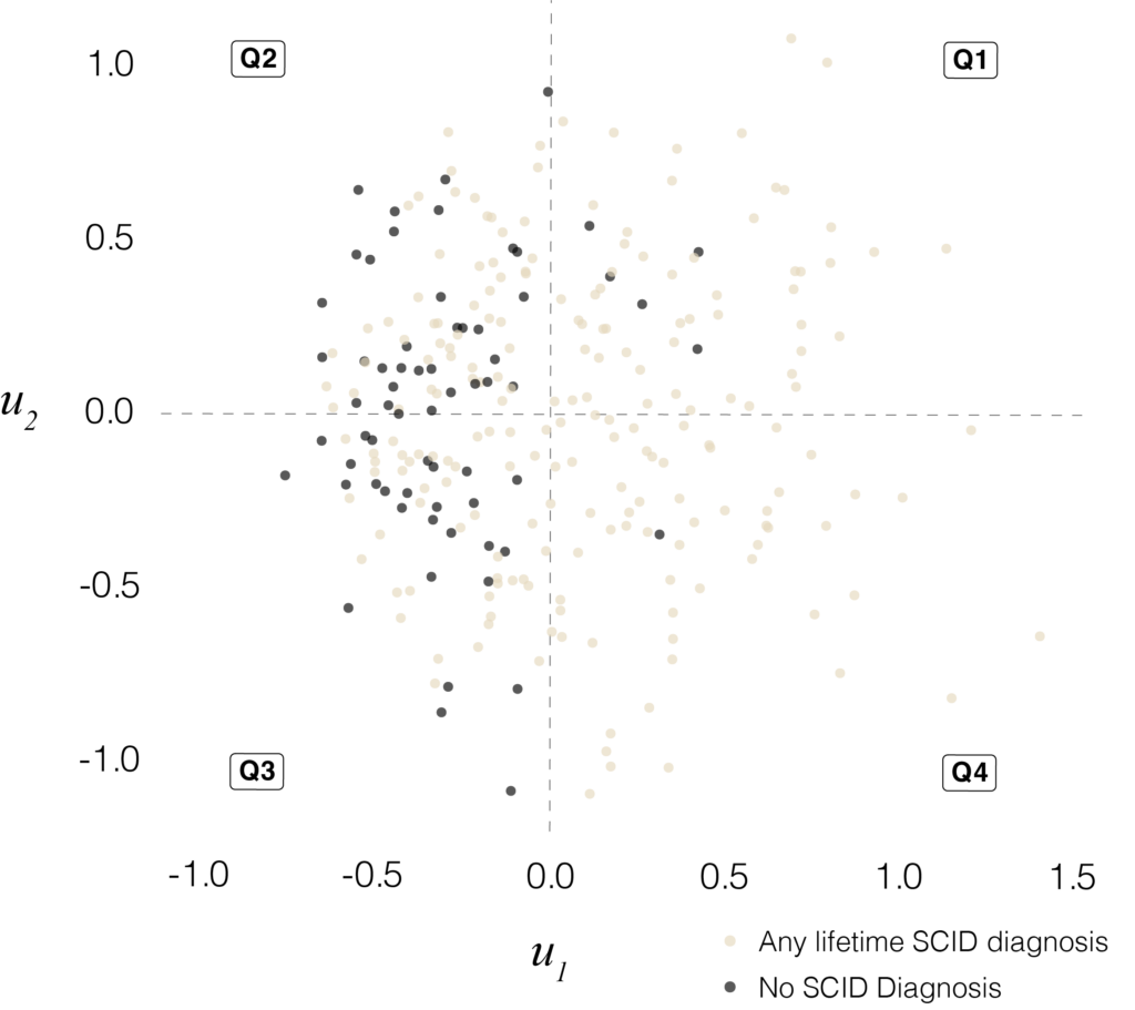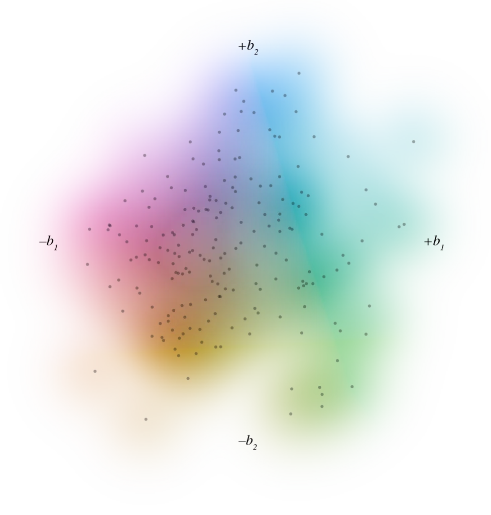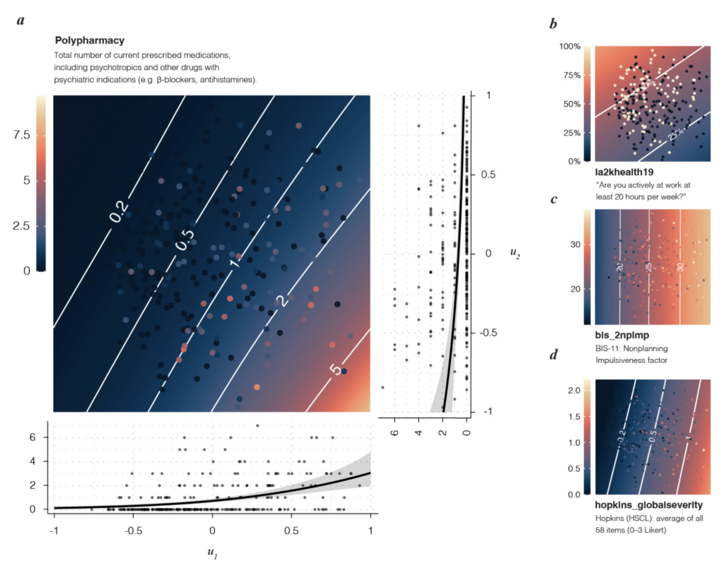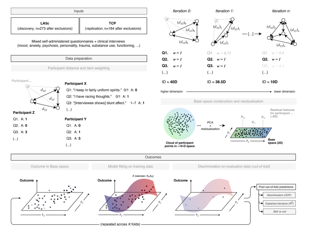 This project builds a two-dimensional map of individual psychometric profiles and uses it as a shared coordinate system for diagnoses, symptoms, functioning and treatment burden. Item-level questionnaire and interview data from two independent transdiagnostic cohorts are treated each as mixed-scale feature spaces. Similarity between participants is quantified within this space, and a robust principal-components step turns that into a low-dimensional base in which each point represents a participant. On top of that base, DSM diagnoses and other variables are modelled as smooth probability or value fields using cross-validated generalised additive models, so the output is a set of calibrated risk surfaces rather than a series of case–control contrasts.
